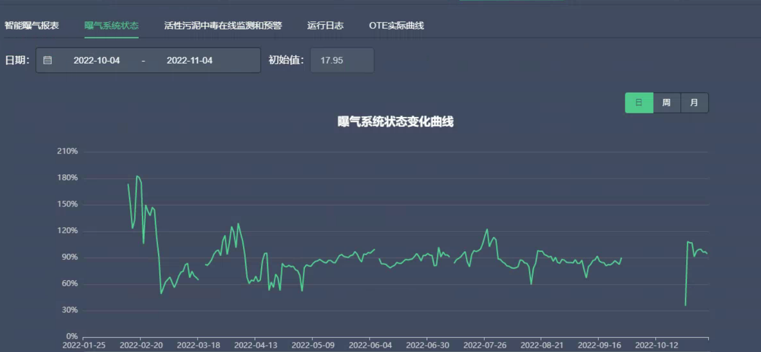 曝气系统在长时间使用后,由于曝气头堵塞,破损会导致氧气利用效率大幅度下降,通过对112个污水厂的调查发现,在运行初期的5-10个月,底部曝气系统因为堵塞导致氧气转移效率可下降达20%。因而对氧气转移效率进行监测即可评估曝气头的状态,进而决定是否需要对其进行清洗或者更换。